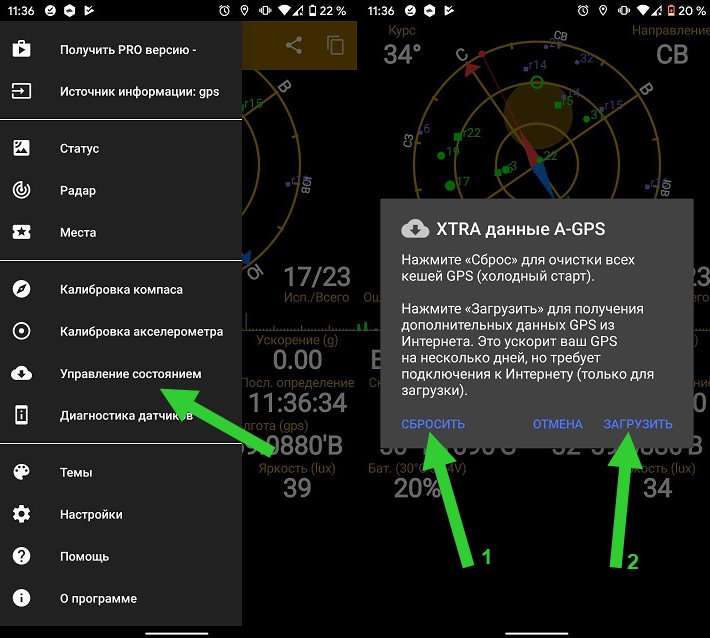 В приложении нажмите в любом месте экрана, затем перейдите в меню и нажмите на «Управление состоянием A-GPS». Нажмите «Сброс», затем вернитесь в «Управление состоянием A-GPS» и нажмите «Загрузить». После этого данные GPS на смартфоне обновятся.
