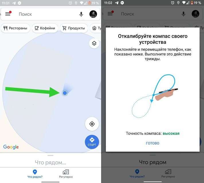 В Google Maps нужно нажать на синий круг, указывающий на ваше место на карте, выбрать во всплывающей вкладке «Откалибровать компас» и следовать незамысловатой инструкции. Калибровка обновит сигнал геолокации, что может решить вашу проблему.