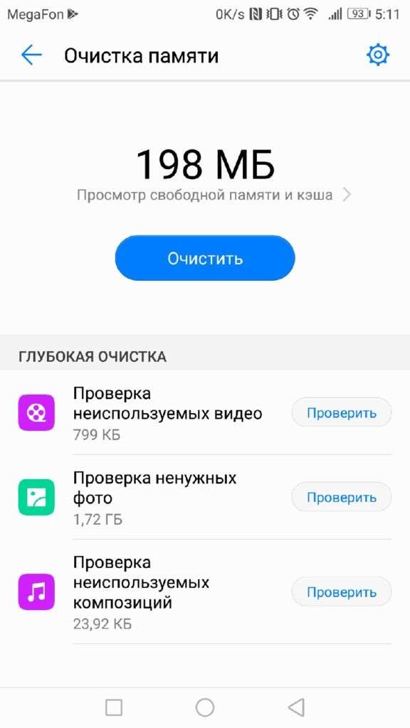 При нажатии на кнопку «Очистка памяти» (в зависимости от того, каким смартфоном вы пользуетесь — Xiaomi, Хуавей или Самсунг, ее название может отличаться), откроется инструмент, с помощью которого можно будет автоматически удалить ненужные и неиспользуемые файлы.