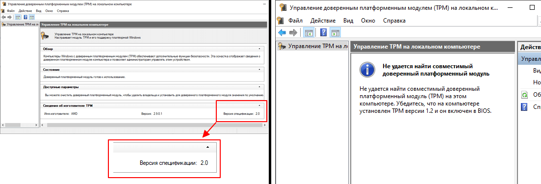 - TPM: снова жмем Win + R, вводим tpm.msc. Если модуль есть, то мы увидим информацию о нем. Если модуля нет или он отключен, система покажет соответствующее сообщение:
