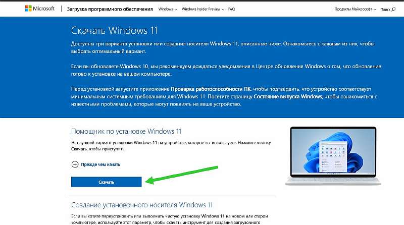 - Открываем сайт Microsoft и качаем «Помощник по установке Windows 11» с верхней части страницы.