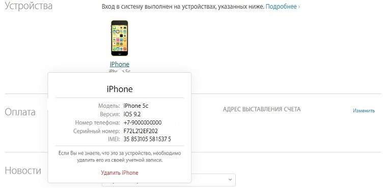 Узнать IMEI можно и на официальном сайте Apple. Для этого вам потребуется войти в свою учетную запись на appleid.apple.com с компьютера, а после прокрутить до пункта “Устройства”. В нем выберите нужный гаджет и щелкните по нему. Появится окно с информацией аппарата, среди которой будет и IMEI.
