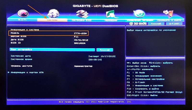 На некоторых компьютерах модель МП отображается в BIOS. Чтобы ее узнать:
