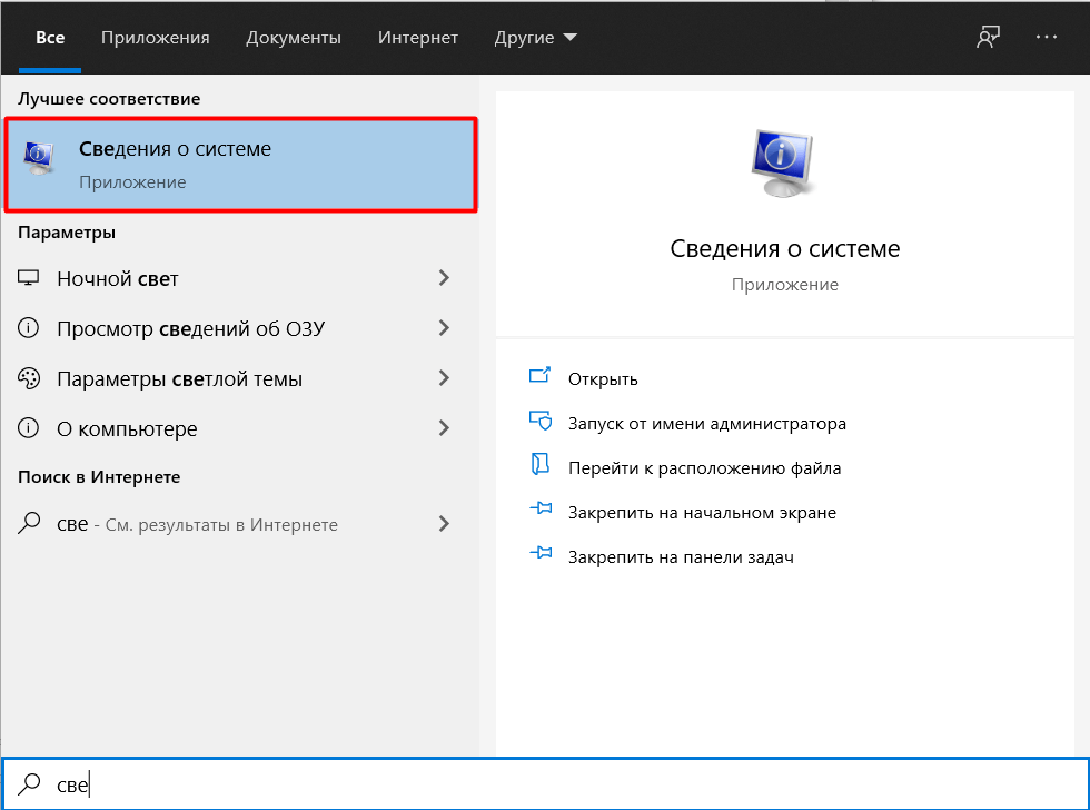 Узнать модель материнской платы можно через стандартную утилиту Виндовс 10, которая так и называется: Сведения о системе. Чтобы ее найти, жмем Пуск, и начинаем вводить «све», после чего сразу всплывает соответствующий пункт: