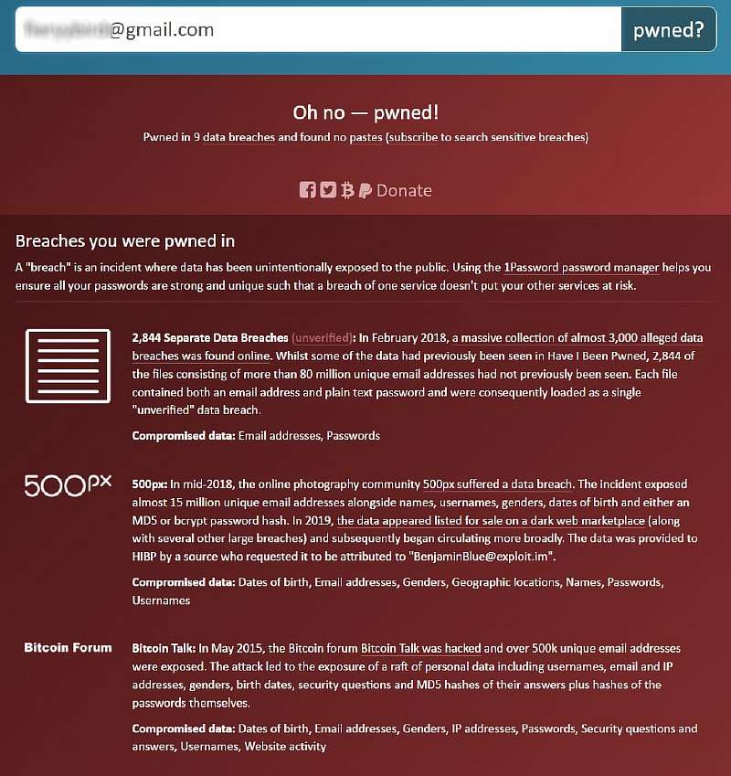 Have I Been Pwned — это сканер Deep Web, который специализируется на выявлении утечек данных. Он предлагает ввести адрес своей электронной почты или номер мобильного телефона, который прогонят по базам данных взломанных сайтов и сервисов, чтобы определить, фигурировал ли он в известных утечках. Вы сможете посмотреть, какие аккаунты могли быть скомпрометированы, и где нужно поменять пароль, чтобы не нарваться на еще большие проблемы.