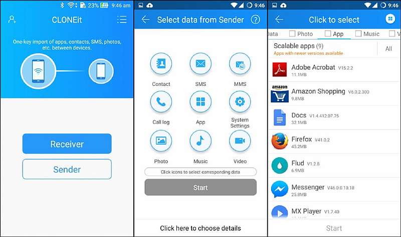 Использование приложения Cloneit и его аналогов — это один из наиболее простых способов копирования файлов, контактов и даже настроек системы с одного устройства на другое без интернета. Для этого вам достаточно просто нажать кнопку «Отправитель» (Sender) в приложении на старом устройстве и кнопку «Получатель» на новом. После подключения телефонов друг к другу (аппарат подключаются напрямую по Wi-Fi) вы сможете выбрать передаваемую информацию и провести копирование.