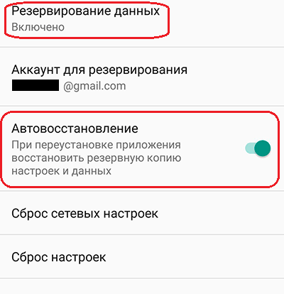 - Далее открываете «Резервирование/копирование данных» и переключаете ползунок в активное положение. Вернувшись в «Восстановление и сброс», делаете активным пункт «Автовосстановление».