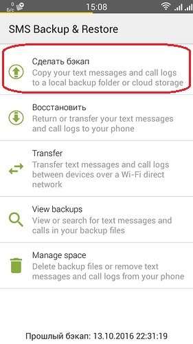 - Первое, что следует сделать — провести сохранение данных. Для этого выбираете пункт «Сделать бэкап».