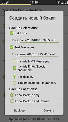 Local Backup and Upload — сохранить бэкап в памяти устройства и отправить куда-либо (например, на Гугл Диск). - Найти бэкап вы сможете по адресу /storage/sdcard0/SMSBackupRestore/ в памяти смартфона, либо там, куда он был отправлен.