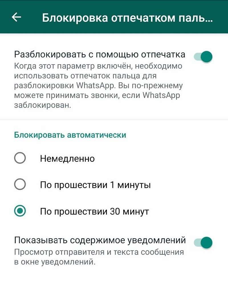 Важно: отпечаток нужен для того, чтобы кто попало не мог зайти в приложение и прочитать там любую переписку. Но Push-уведомления с текстом входящих сообщений продолжат отображаться на заблокированном экране — так что если хотите максимальной конфиденциальности, не забудьте их тоже отключить.