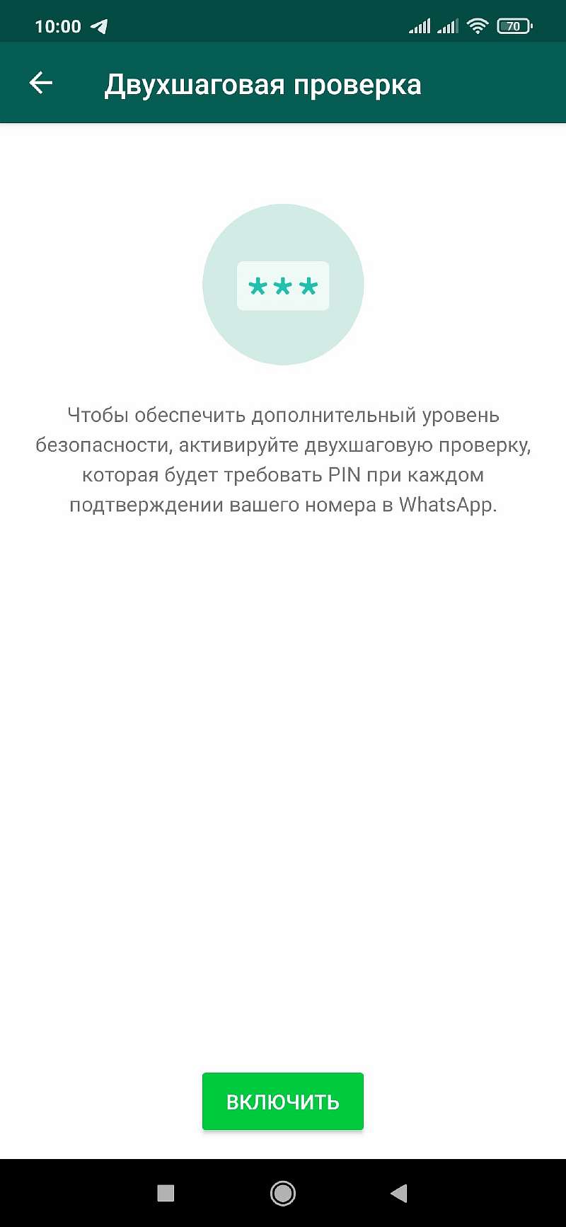 Простой, но, наверное, наиболее эффективный способ защиты. При включении вам придется указать 6-значный PIN-код, который нужно будет вводить при входе в WhatSapp на каждом новом устройстве. Таким образом человек, который на время получит в руки ваш смарт, не сможет быстро залогиниться на другом телефоне с помощью SMS-кода.