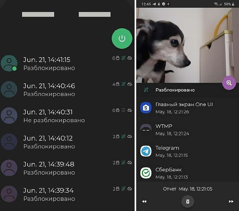 - Если гаджет разблокируют, WTMP запомнит время, сделает снимок фронтальной камерой, и начнет запоминать, какие приложения и файлы открывает посторонний.