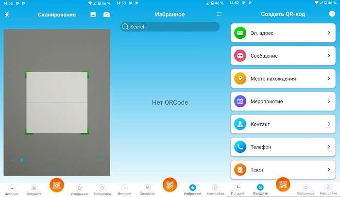 Green Apple Studio сделала сканер QR кодов для Андроид с самой высокой оценкой от пользователей Play Market. Как и предыдущая программа он умеет не только считывать коды, но и генерировать их, но функционал тут гораздо шире — можно зашифровывать мероприятия, контакты и даже текущую геолокацию.