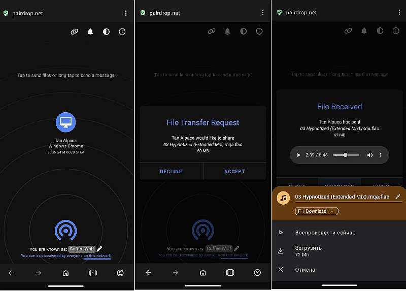 Везде, где можно открыть интернет-браузер (Chrome, Firefox, Safari и т. д.), PairDrop будет работать. Этот сервис соединяет два устройства в одной сети, и файлы очень быстро передаются через Wi-Fi. Вот как его использовать: