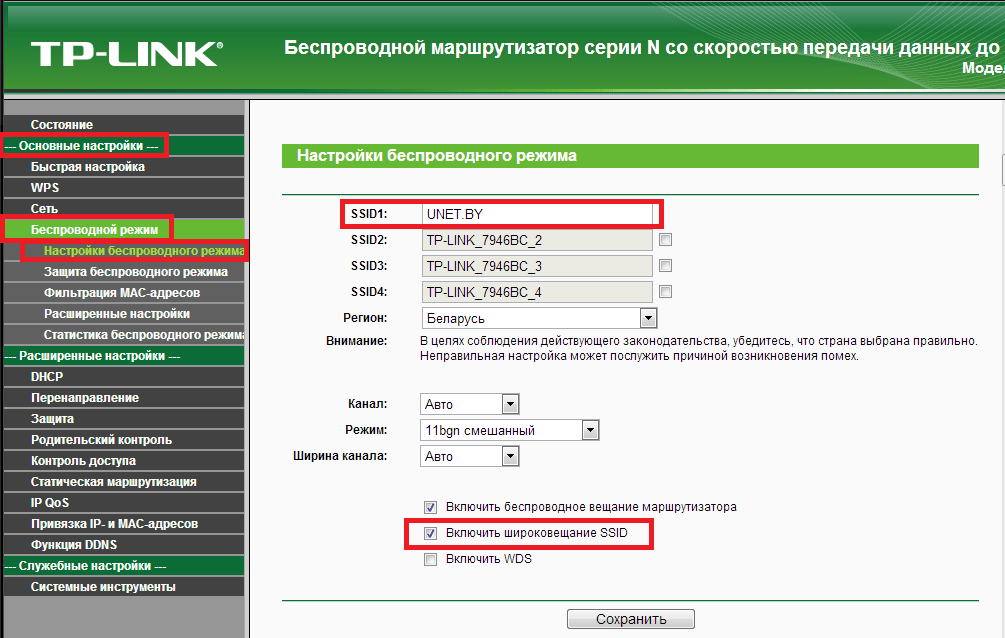 Изменение или скрытие SSID обычно не прячут глубоко в настройках. На примере роутера TP-Link эта опция находится во вкладке: Основные настройки > Беспроводной режим > Настройки беспроводного режима: