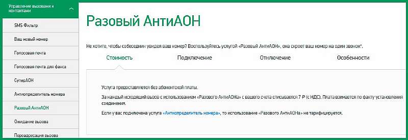 У данного оператора подключение данной услуги проходит так же, как и у остальных. Подключить антиопределитель номера можно через личный кабинет SkyPoint, выбрав услугу «Запрет определения номера» из списка. Также можно единоразово скрыть номер, добавив перед номером *52*.