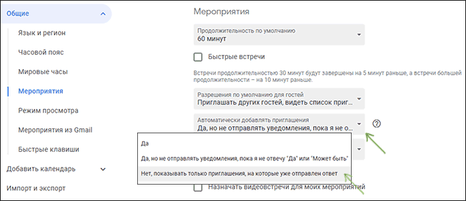 - В пункте «Автоматически добавлять приглашения» поставьте “Нет, показывать только приглашения, на которые уже отправлен ответ».