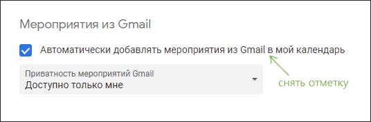 - Чуть ниже, в пункте «Мероприятия из Gmail», уберите галочку в чекбоксе «Автоматически добавлять мероприятия из Gmail в мой календарь».