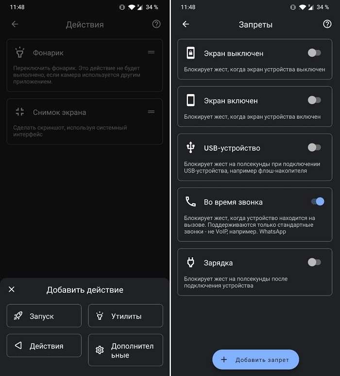 Далее нужно настроить действие, которое будет выполняться постукиванием по корпуса, и задать ограничения на его срабатывание. Например, можно отключить жест когда экран устройства заблокирован или открыто определенное приложение, когда вы разговариваете по телефону и т.д.