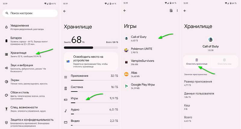 - Перейдите в настройки и выберите «Хранилище». Там будет информация об используемой памяти и список категорий. Пройдитесь по «играм», «программам», и с помощью кнопок «Очистить хранилище» и «Очистить кеш» освободите память.