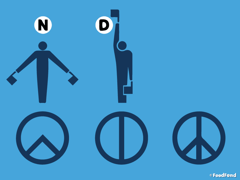Кто-то усмотрел в символе мира отпечаток лапки голубя, который сам по себе является точно таким же символом. Однако на самом деле причина происхождения значка политическая. Он появился во время американских демонстраций против ядерного вооружения и представляет собой 2 семафорных сигнала, соответствующие буквами «N» и «D» — nuclear disarmament или ядерное разоружение.