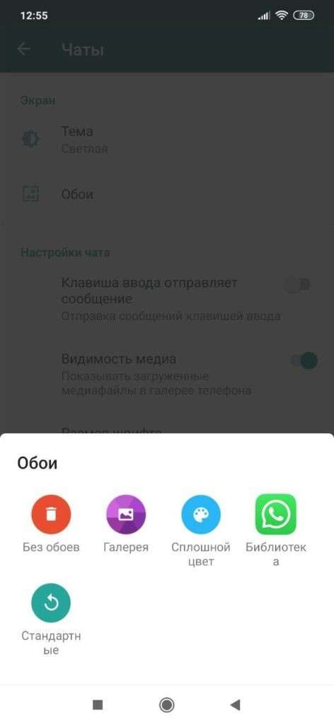 Если стандартные обои надоели — их можно заменить. Для этого заходим в Настройки — Чаты — Обои, выбираем из предложенных вариантов подходящий или загружаем свою картинку: