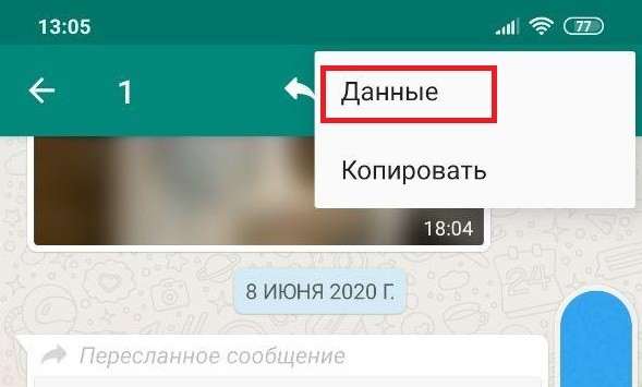 Кроме галочек можно посмотреть дополнительную информацию о любом отправленном сообщении. Для этого надо открыть чат, зажать пальцем на нужном сообщении, на появившейся вверху панели нажать 3 точки, и выбрать Данные: