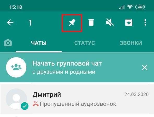 Если сообщение важное — чат с этим пользователем можно закрепить поверх остальных. Для этого заходим в список чатов, нажимаем на нике выбранного пользователя пальцем, и на появившейся сверху панели жмем на этот значок: