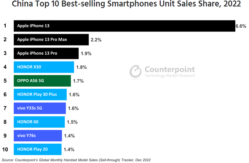В ТОП-10 самых продаваемых смартфонов в Китае все три первые строчки занимают iPhone. Первым с впечатляющим отрывом стал базовый iPhone 13, доля которого составила 6.6% от всех проданных смартфонов. На втором месте расположился iPhone 13 Pro Max с долей 2.2%, а на третьей – iPhone 13 Pro, 1.9%.