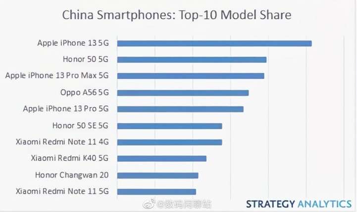 Первое место с отрывом от остальных занял iPhone 13. Он опережает Honor 50 и еще один аппарат купертиновцев — iPhone 13 Pro Max, занявший третье место. Неожиданно, на четвертой строчке по популярности в Китае идет бюджетный OPPO A56, а замыкает пятерку лидеров iPhone 13 Pro.