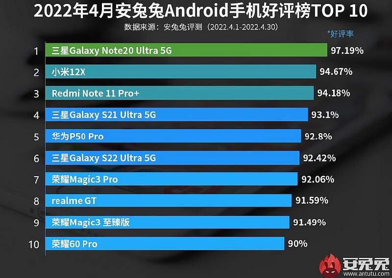 Самым «любимым» смартфоном был признан флагманский старичек Samsung Galaxy Note 20 Ultra, которым довольны 97.19% пользователей. На втором месте оказался Xiaomi 12X с результатом 94.67%, а замкнул тройку довольно бюджетный Redmi Note 11 Pro+ (94.18%).