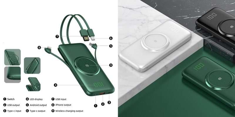 На морозе любой аккумулятор садится быстрее, так что повербанк переходит в разряд незаменимых устройств. Этот может заряжать аж до 5 гаджетов одновременно: один — по беспроводной зарядке, и еще 4 по проводам, которые интегрированы в корпус. Есть два варианта: емкостью на 10 и 20 тыс. мАч. Оба идут с экраном, который показывает оставшийся уровень заряда.