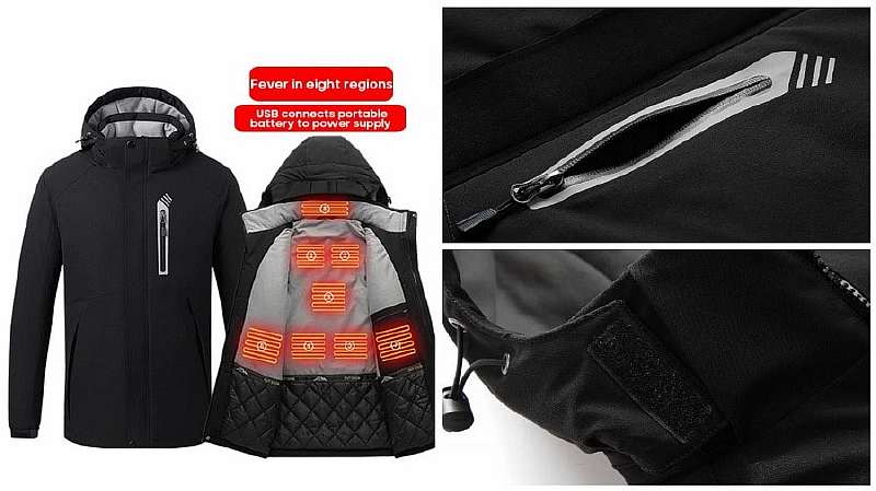 Если вы не любите массивные пуховики, можно взять лёгкую куртку, в которой при необходимости включается подогрев. Она сама по себе достаточно тёплая и толстая, имеет имеет 8-зонный обогрев и 3 температурных режима: даже в -20º на легкий свитер будет вполне комфортно. Тепловодные нити запитываются от повербанка и не боятся машинной стирки.