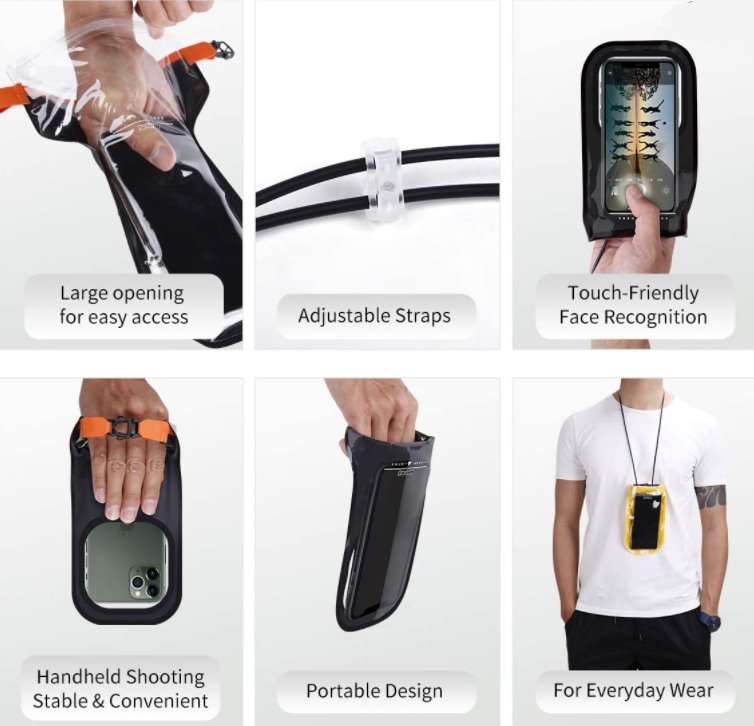 Качественный герметичный чехол подходит для любых смартфонов с диагональю дисплея до 7 дюймов. Можно самому выбирать одну из 6 степеней водонепроницаемости, подворачивая пакет нужное количество раз. Удобный ремешок дает возможность носить гаджет на шее или плече.