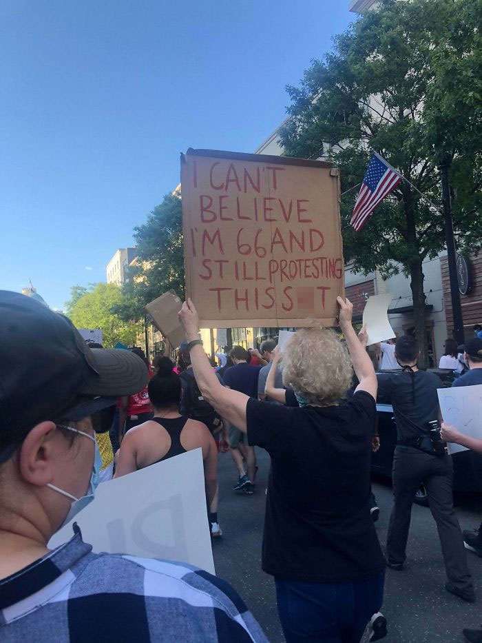 Плакат в руках пожилого демонстранта из Северной Каролины: «Поверить не могу, что в свои 66, до сих пор протестую против этого дерьма».
