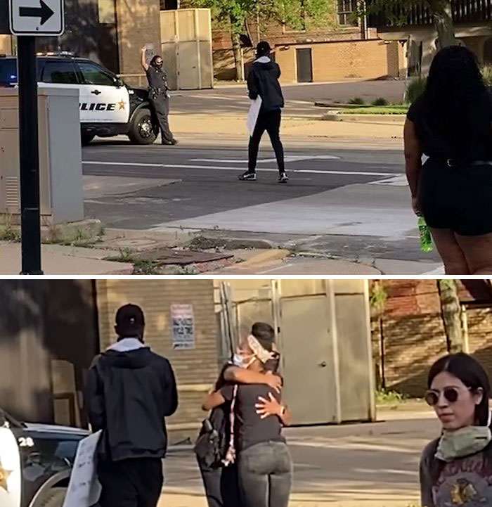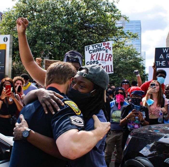 Белый коп обнимается с чернокожим протестующим, который не может сдержать эмоций.