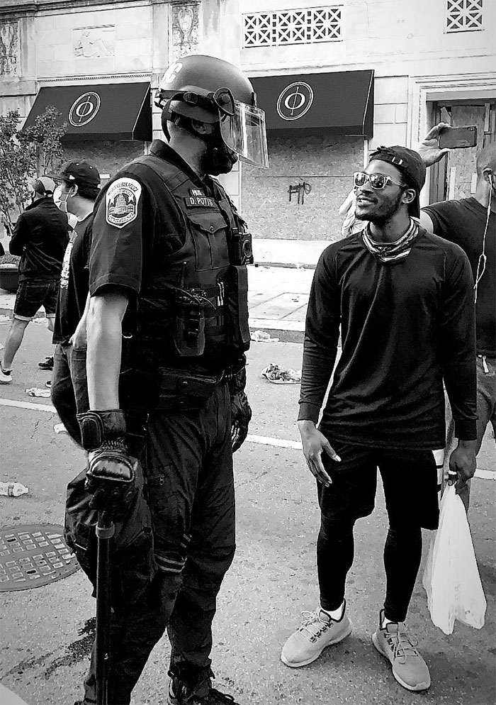 Полицейский мирно беседует с протестующим в Вашингтоне.