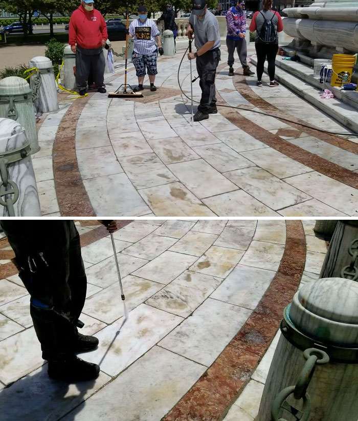 Местные жители отмывают памятник, разрисованный демонстрантами.