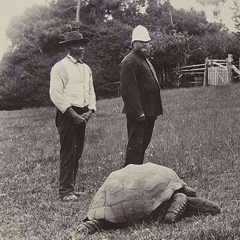 Рекорд долголетия принадлежит альдабрской черепахе по имени Джонатан. Джонатан вылупился из яйца в 1832-м году и уже дожил до почтенных 189-и лет. Вот его раритетная фотография, по оценкам сделанная до 1886 года.