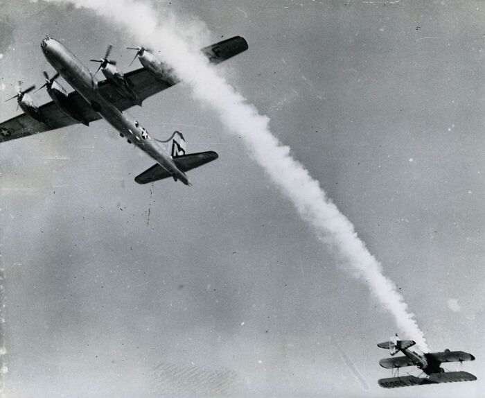 Фотограф Билл Крауч присутствовал на авиашоу с более чем 60 000 зрителей, которые были ошеломлены чудом не состоявшимся столкновением биплана и огромного B-29. Последний должен был лететь через дымовой след биплана и в конечном итоге прошел слишком близко, но воля случая предотвратила ужасную трагедию.