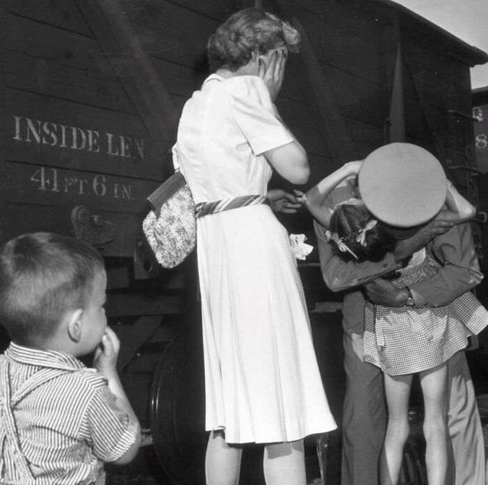 Чтобы сделать этот снимок, Эрлу Банкеру пришлось набраться терпения и 24 часов ждать прибытия поезда с американскими солдатами после Второй мировой войны. Ждал не зря — самый драматичный момент воссоединения солдата с семьей Бункер запечатлел очень удачно.