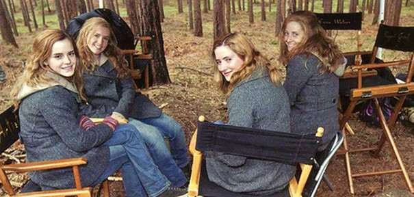 Эмма Уотсон со своими дублерами на съемках фильма о Гарри Поттере