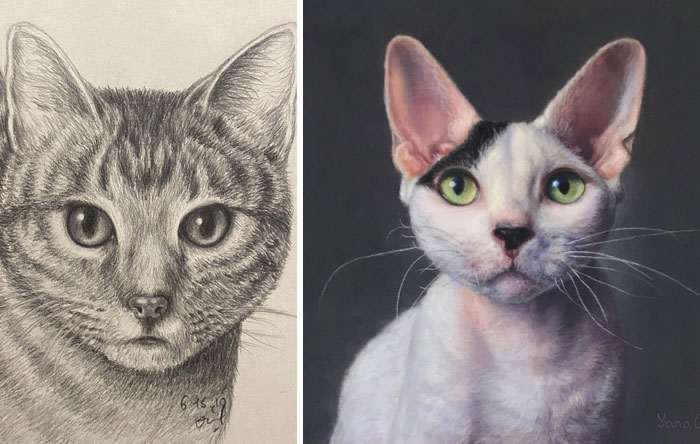 Первый рисунок кошки и последняя работа. Прогресс за 3 года
