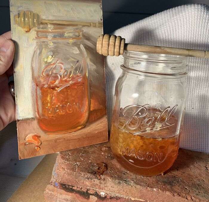 Картина маслом и настоящая банка с медом рядом