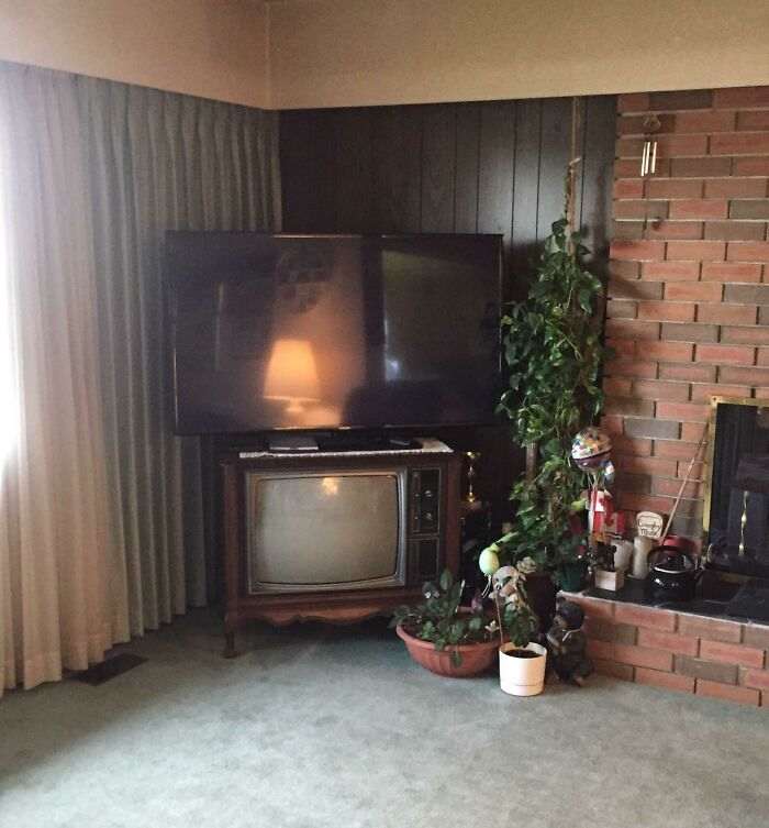 Бабушка использует старый телевизор как подставку для нового. Как изменилась техника