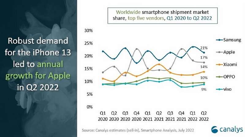 Лидером по итогам первого полугодия 2022 года стала компания Samsung, на долю которой пришелся 21% всех проданных смартфонов. Эксперты сообщают, что такого успеха корейцам удалось добиться из-за удачной линейки Galaxy A. Второе место, несмотря на обилие премиальных и отсутствие бюджетных моделей, заняла Apple, а третье осталось за Xiaomi – 17% и 14% соответственно. Также в пятерку лидеров попали OPPO (10%) и Vivo (9%).