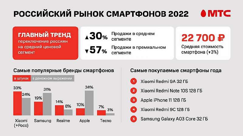Компания МТС поделилась любопытной статистикой по российскому рынку смартфонов в 2022-м году. В лидерах все те же бренды, что и в прошлом, однако баланс сил медленно, но верно смещается. Люди стали покупать намного меньше премиальных смартфонов — их продажи упали на 57%, и все чаще стали смотреть в сторону устройств среднего ценового сегмента — продажи выросли на 30%.