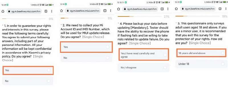 - Войти на смартфоне в свой Mi Account (который был указан в заявке), пройти тестирование и ответить на некоторые вопросы.