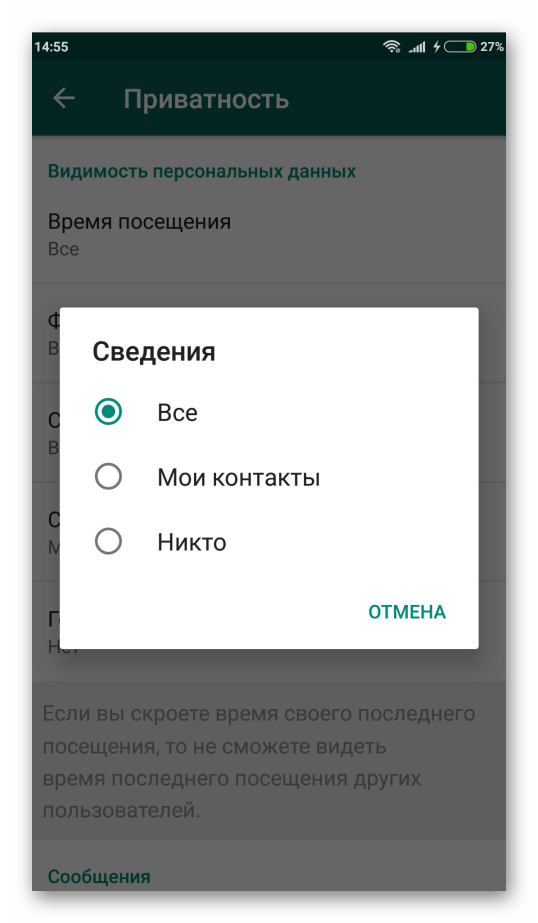 В настройках приватности можно не только скрыть от собеседников, прочитали ли вы присланные вам сообщения. Так же можно спрятать от посторонних глаз информацию о том, когда вы в последний раз были в сети. Для этого нужно обратиться к параметру Время посещения и установить, кому будет доступна эта информация.