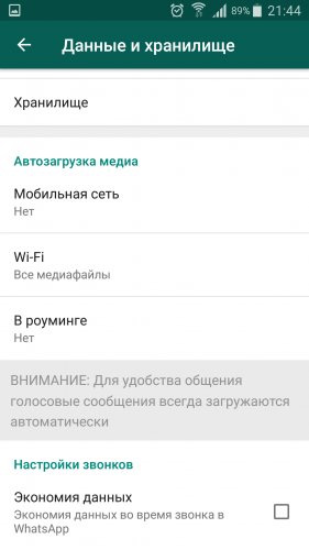 Вы пользуетесь лимитированным интернетом и часто звоните по Ватсапу знакомым? В таком случае имеет смысл ограничить объем данных, которые может потреблять приложение. Для этого зайдите в настройках в раздел Данные и хранилище. Просто поставьте галочку напротив пункта Экономия данных.